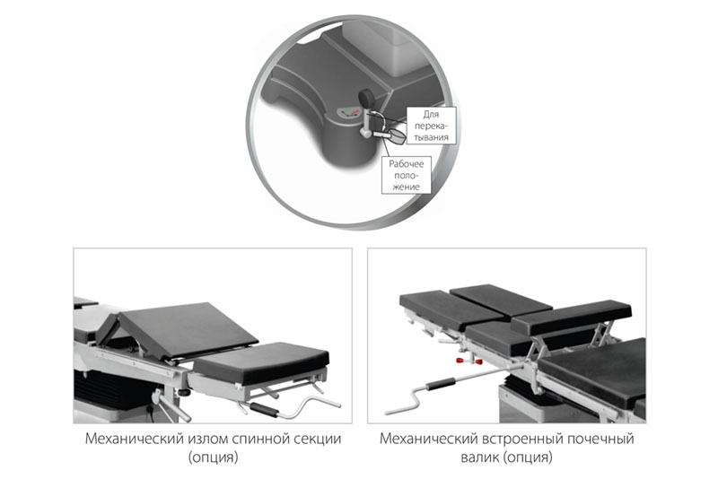 Подъем и опускание панели стола выполняется при помощи гидродомкрата ножной педалью. Органы управления продольными и поперечными наклонами и спинной секцией расположены в одном месте со стороны головы. Наличие встроенных колес дает возможность свободного перемещения стола внутри операционной.