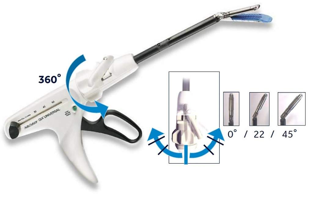 Изгиб кассет ENDO GIA Ultra Roticulator возможен в двух направлениях, угол изгиба фиксируется в положениях 22° и 45°. Вращение и изгибание кассет осуществляется простым нажатием на кнопки, удобно расположенные на рукоятке аппарата.